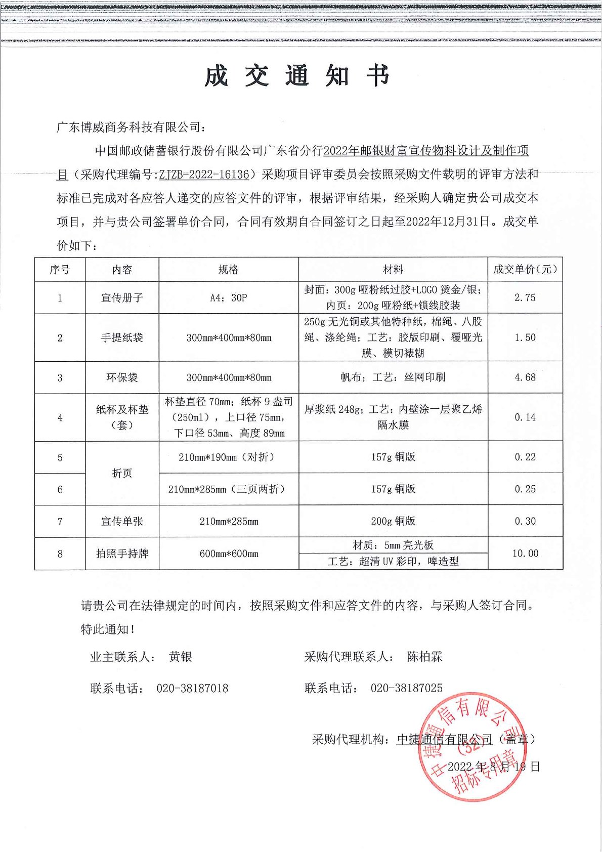 热烈祝贺我公司成功中标中国邮政储蓄银行股份有限公司广东省分行项目,我们对取得这一成就感到自豪,并衷心感谢所有参与项目的同仁伙伴们的辛勤付出和专业能力。同时,感谢我们的合作伙伴和客户对我们的信任和支持,我们将继续保持紧密合作,共同推动项目的圆满成功完成。